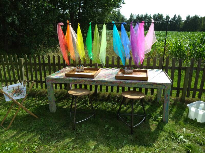 Voor ons is ook de vakantie begonnen. Het buitenkeukentje is weer heerlijk in gebruik en we hebben vandaag samen een buiten atelier gemaakt.