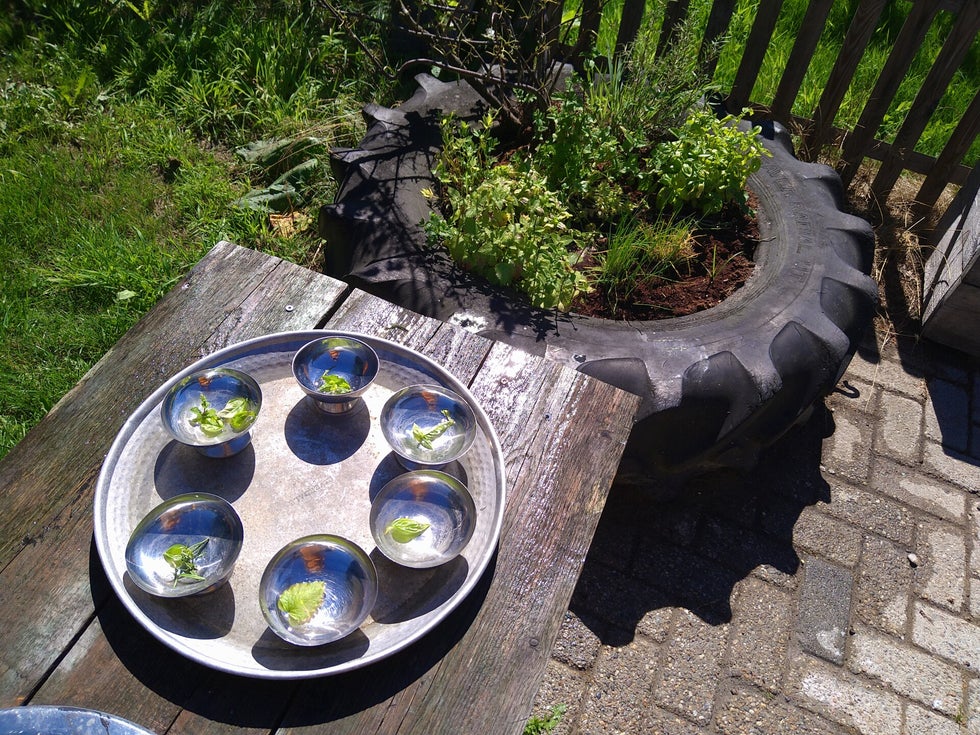 Wij hebben naast het buitenkeukentje een tractor wiel met daarin allemaal geurende kruidenplantjes staan. Deze mogen geplukt worden om er vervolgens heerlijke soepjes mee te maken.