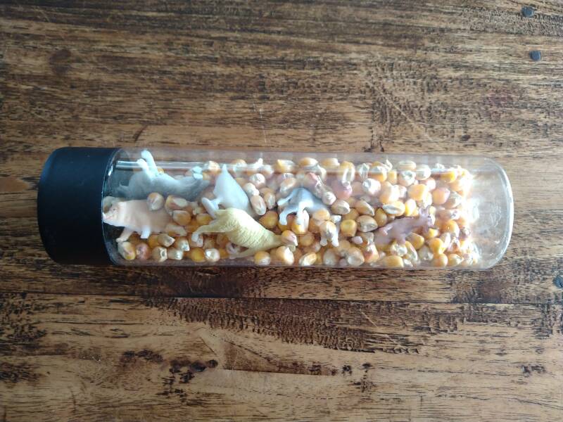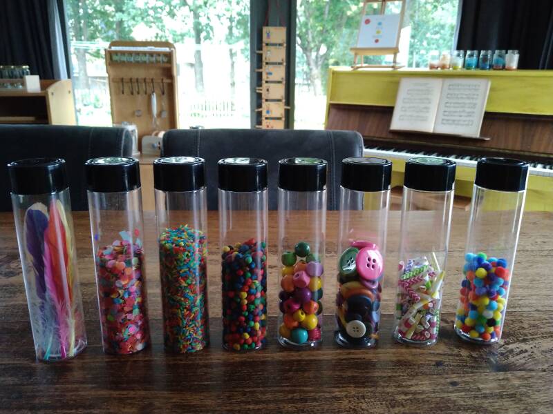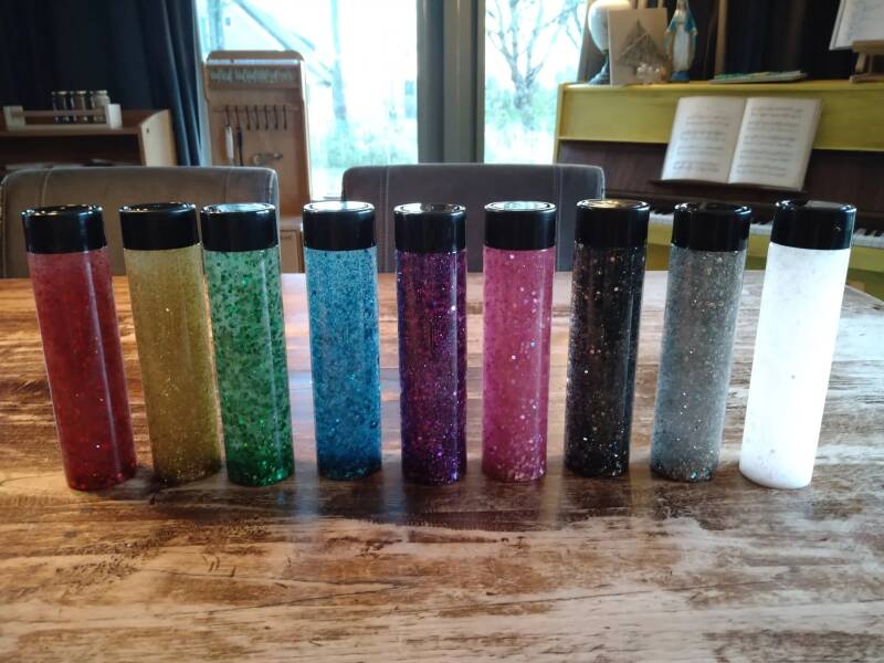 In deze flessen zitten 'droge materialen'. Zoals je ziet kan het echt van alles zijn en kun je eindeloos variëren. Kies of maak wat flessen die verschillen qua gewicht en verschillend geluid maken.