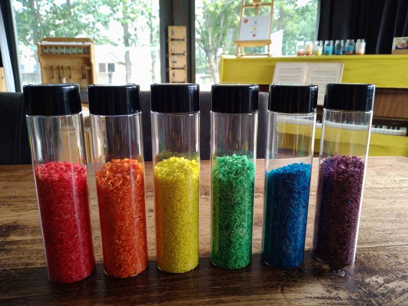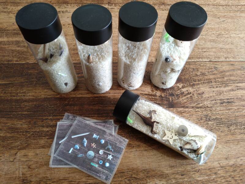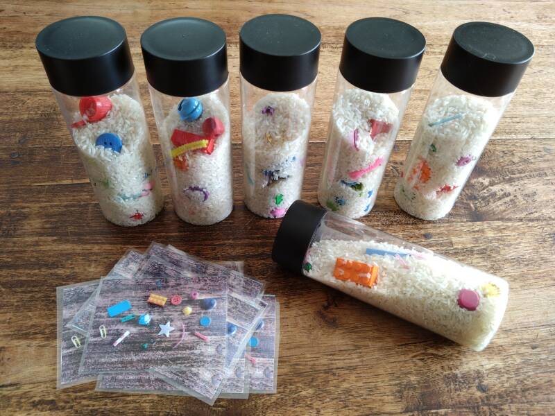 Sensorische flessen gevuld met witte rijst met daarin verstopt allemaal leuke spulletjes. Op het kaartje kun je zien wat er in de fles zit en kun je ze opzoeken. Ze kunnen wel verschillen van kleur....