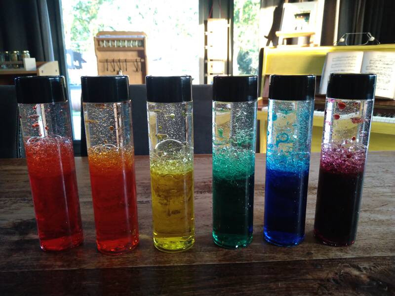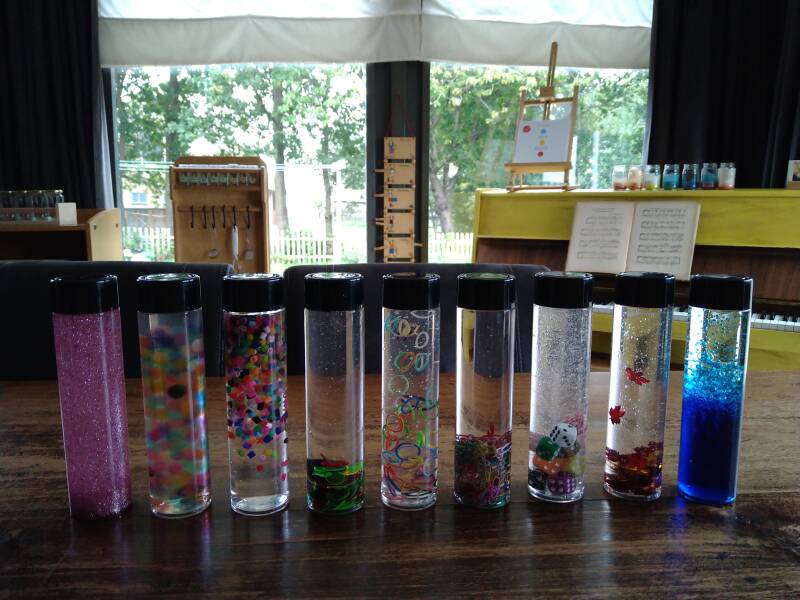 Sensorische flessen met vloeistof en mooie materialen erin die langzaam heen en weer bewegen. Er zijn veel manieren om deze sensory bottles te maken. Doorzichtige shampoo, gel, glycerine, glucosestroop, baby olie of lijm...
