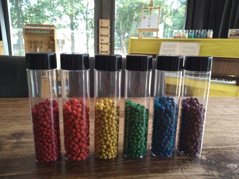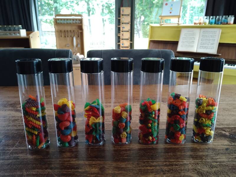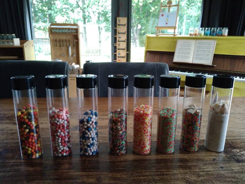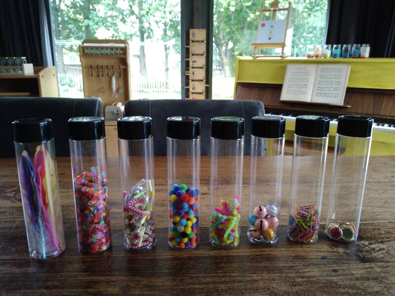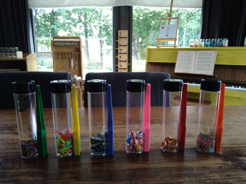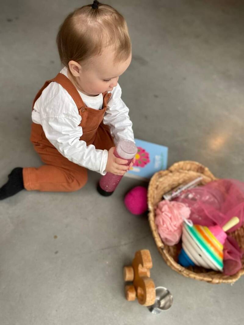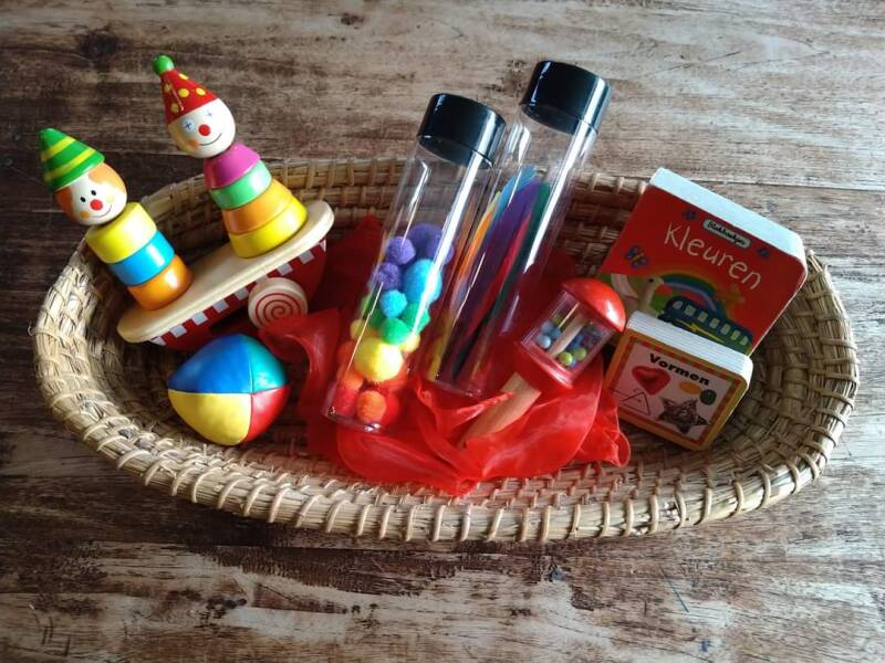 Bied er eerst niet teveel tegelijk aan. Leg er eerst maar eens een stuk of drie in de box. Kies dan voor flessen die verschillen in gewicht en verschillend geluid maken. Later, zeker als ze goed zelf kunnen zitten kun je er meer tegelijk aan bieden. Presenteer ze dan bijvoorbeeld in een mooie schaal of in een mandje. Het is ook erg leuk om de buisjes toe te voegen aan een Sensorische Schattenmandje.