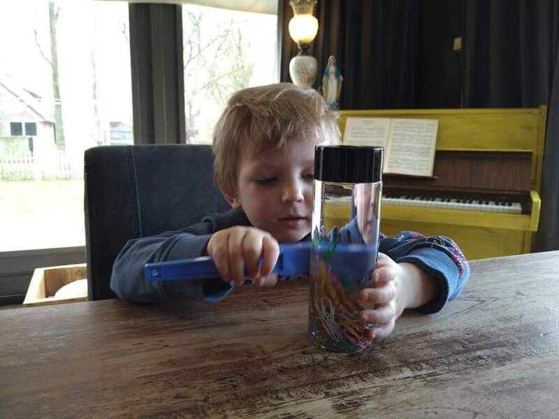 Sensorische flessen met magnetische materialen er in. Super leuk om te ontdekken met de magneetstaaf. De magneetstaaf kun je ook los vinden in de webshop bij sensopatisch spel materialen.
