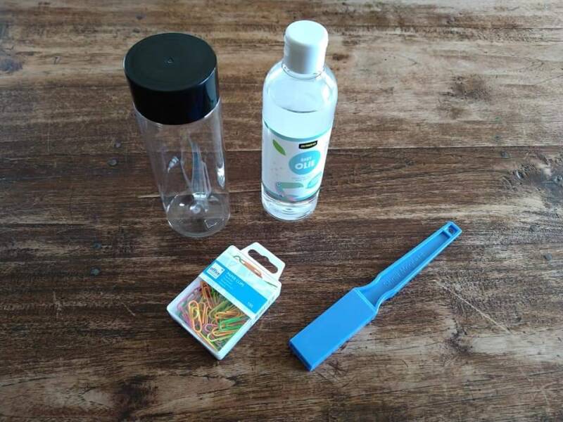 Sensorische flessen met olie en paperclips. De flessen met de paperclips maak ik met doorzichtige olie in plaats van met water en lijm. Omdat paperclips in water gaan roesten, in olie niet. Super leuk om te ontdekken met de magneetstaaf.