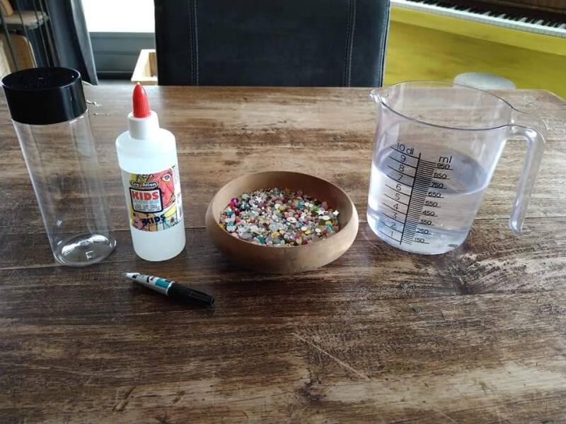 Neem een schone fles. Doe een halve fles doorzichtige kinderlijm er in en voeg hier warm (niet heet) water aan toe. Doe hem nog niet helemaal vol, want het materiaal moet er nog bij in. Doe de dop er op en schud de fles flink!