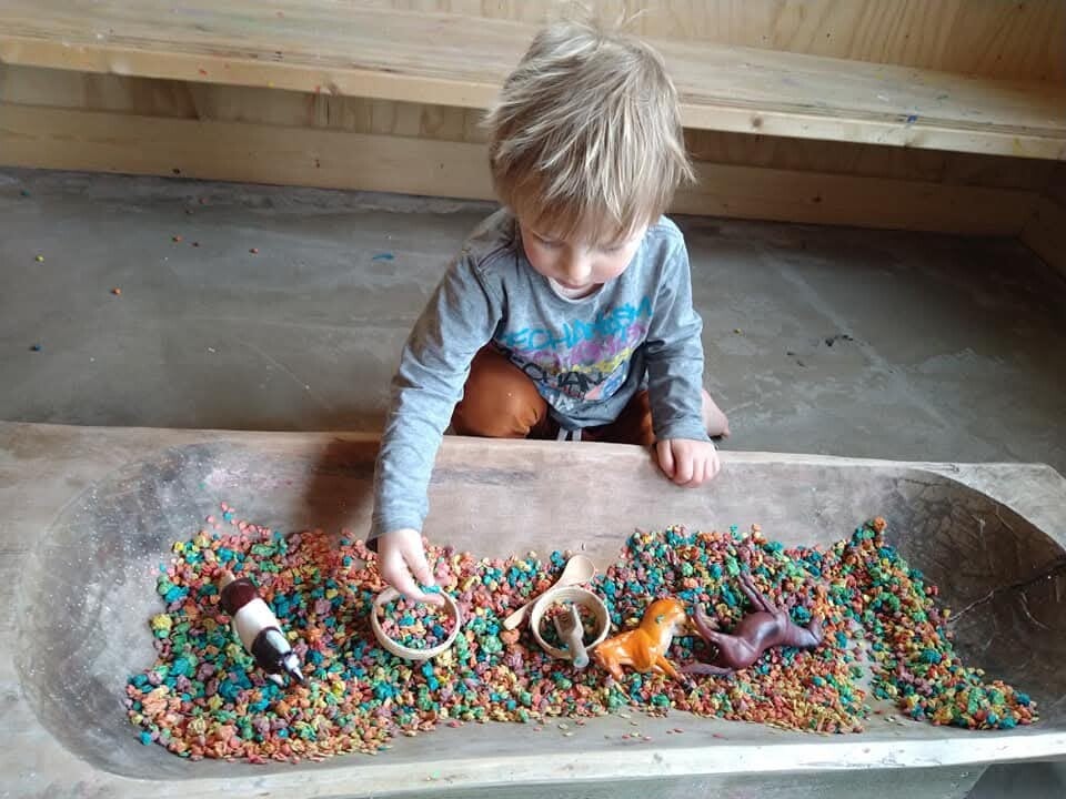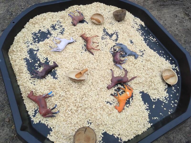 Omdat we bezig zijn met het ontdekken van activiteiten voor jonge kinderen hebben we haver gebruikt. Voor wat oudere kinderen is zaagsel een goede vervanging.