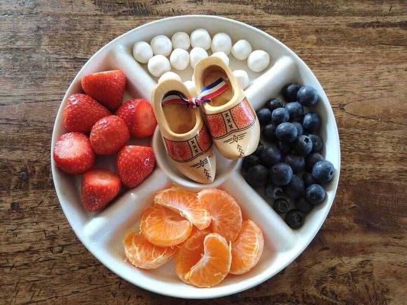 (Bijv. Monkey Platter Holland: 🍓 aardbeien (rood), ⚪️ mozzarella (wit), 🔵 blauwe bessen (blauw) en 🍊 mandarijn (oranje))