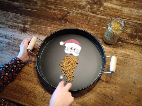 Als de baard klaar is laat ze dan heerlijk kliederen en spelen met het materiaal. Voeg dan eventueel wat bakjes en schepjes toe.