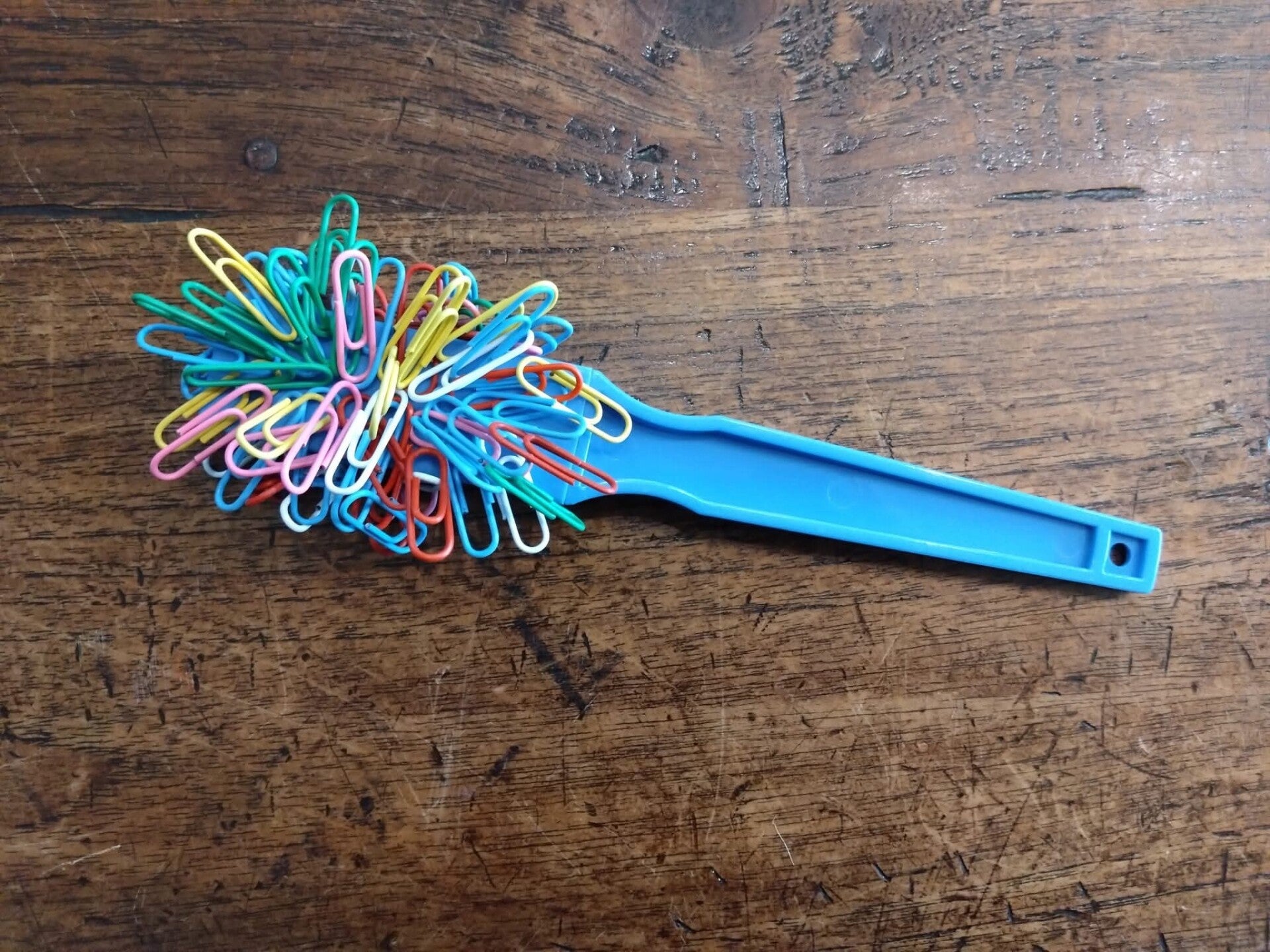 Zakje paperclips in een mooi opbergzakje met een lintje. Ze zijn magnetisch en daarom leuk om te combineren met een magneetstaaf.